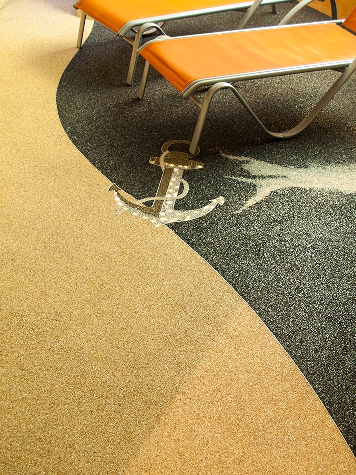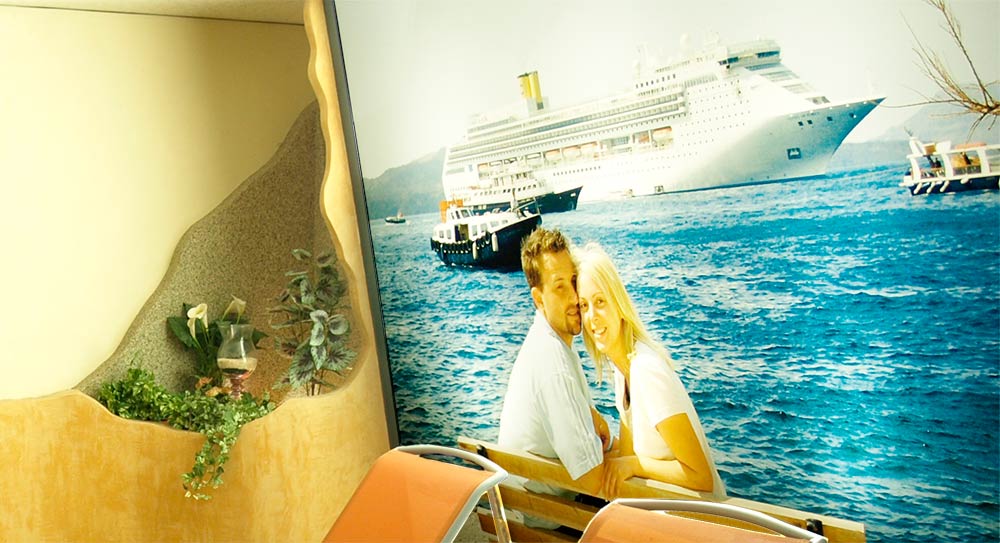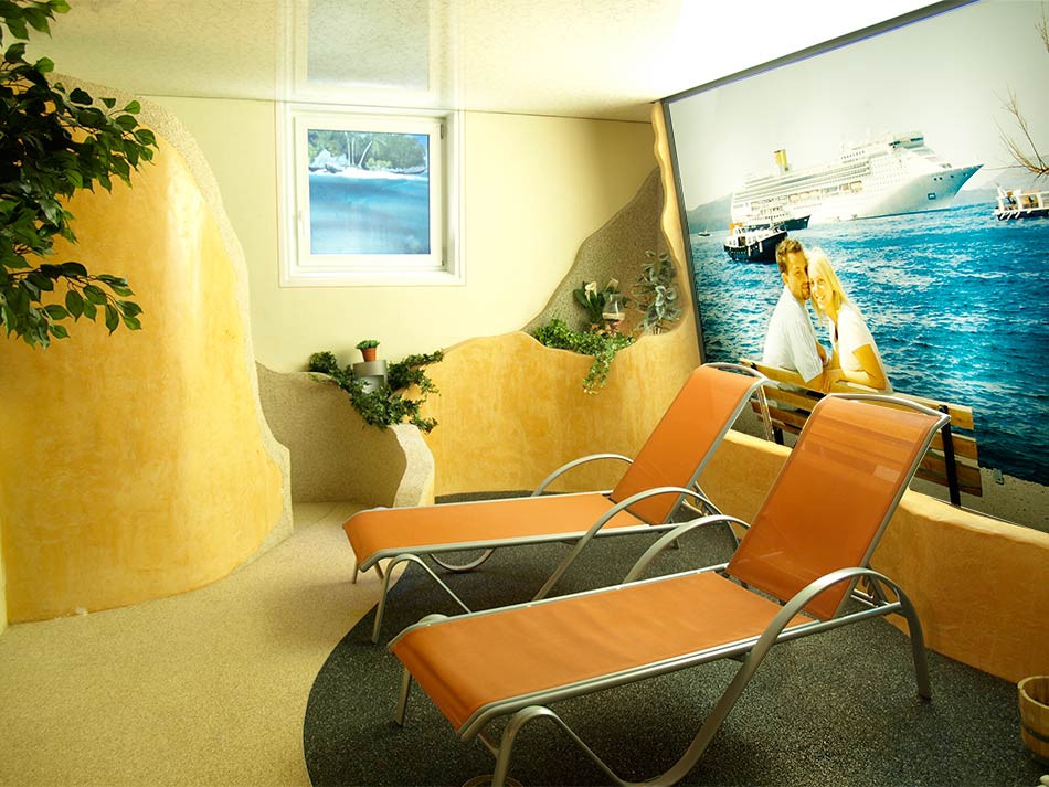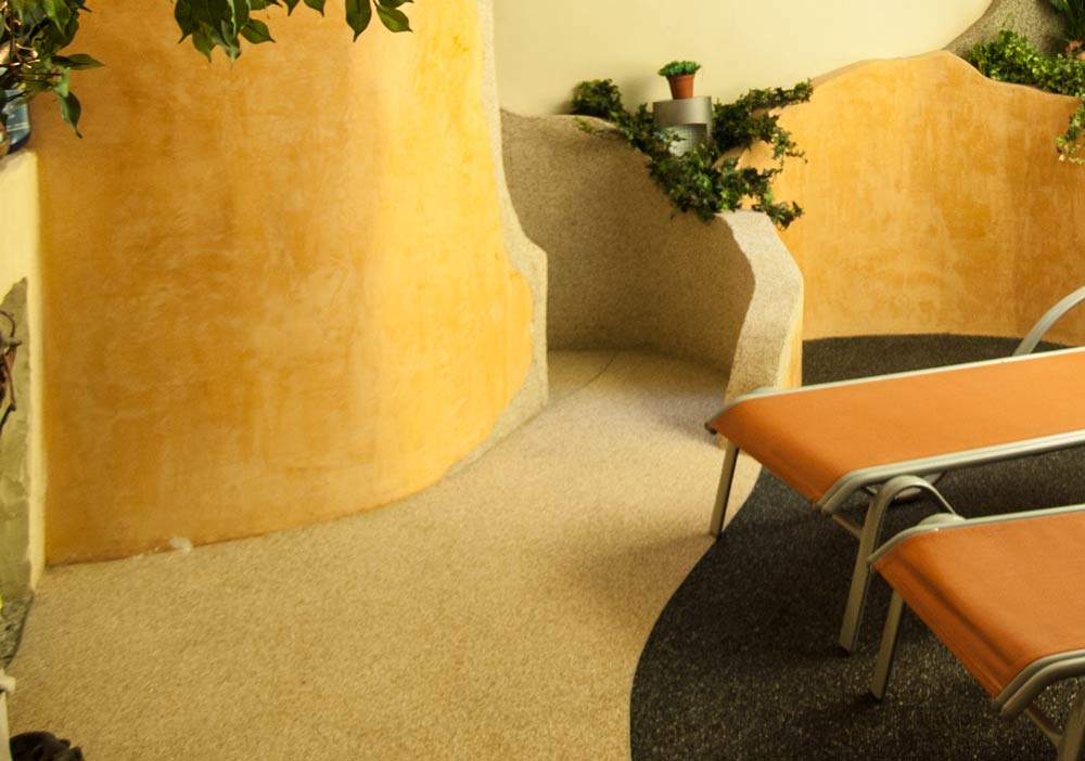 Hier wurde ein privater Saunabereich mit Böden und Wänden aus Natursteinteppich gestaltet. Oben befindet sich eine Spanndecke. Auf der rechten Wand ist eine bedruckte Lichtdecke mit Zweifachfunktion: einmal weiches Licht zu spenden und andererseits durch das Bild Emotionen zu wecken.