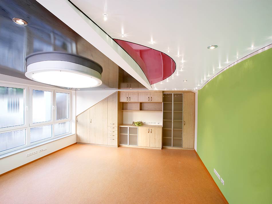 Spanndecken drücken jedem Raum ihren Stempel auf, wenn Farben und Formen intensiv sind. Man kann aber auch das Gegenteil erreichen und sich für das zurückhaltende und unaufdringliche weiss entscheiden. In der Mitte des Raumes ist eine Lichtdecke angebracht: diese spendet ein sehr weiches Licht, das dem Tageslicht sehr ähnlich ist.