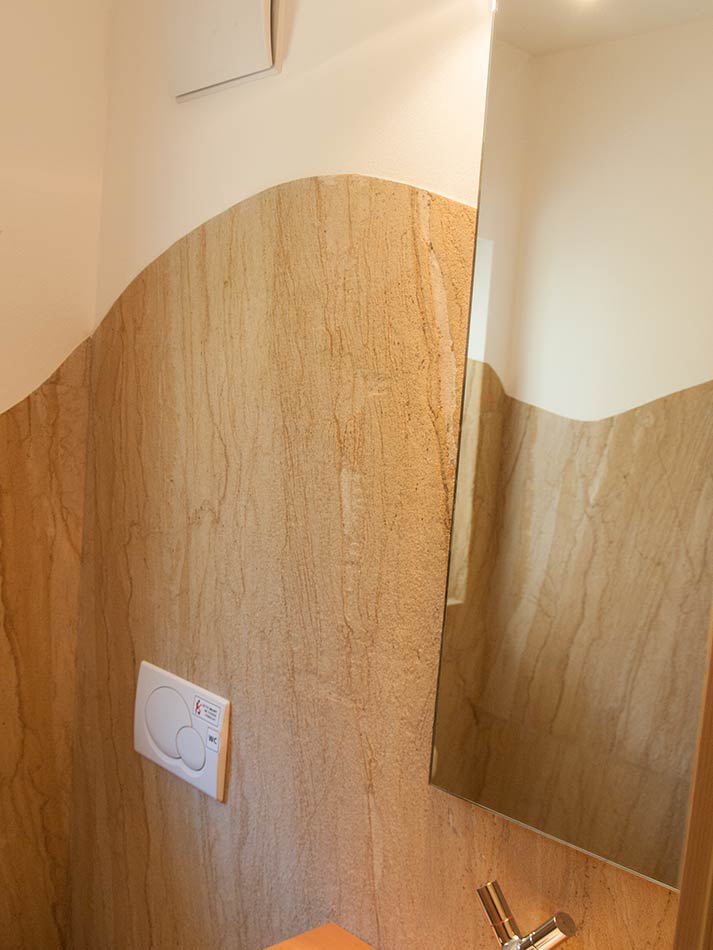Wände mit Steintapeten sind in 14 Farben im Format bis 200×600 cm erhältlich und werden im Ganzen fugenlos geklebt. Sie kosten gleich viel wie Natursteinteppiche und es ist eigentlich nur eine Frage des Geschmacks, für welche Art sich der Kunde entscheiden soll.